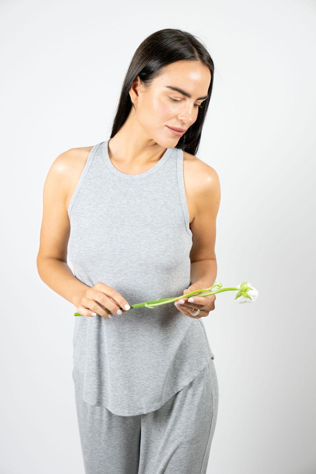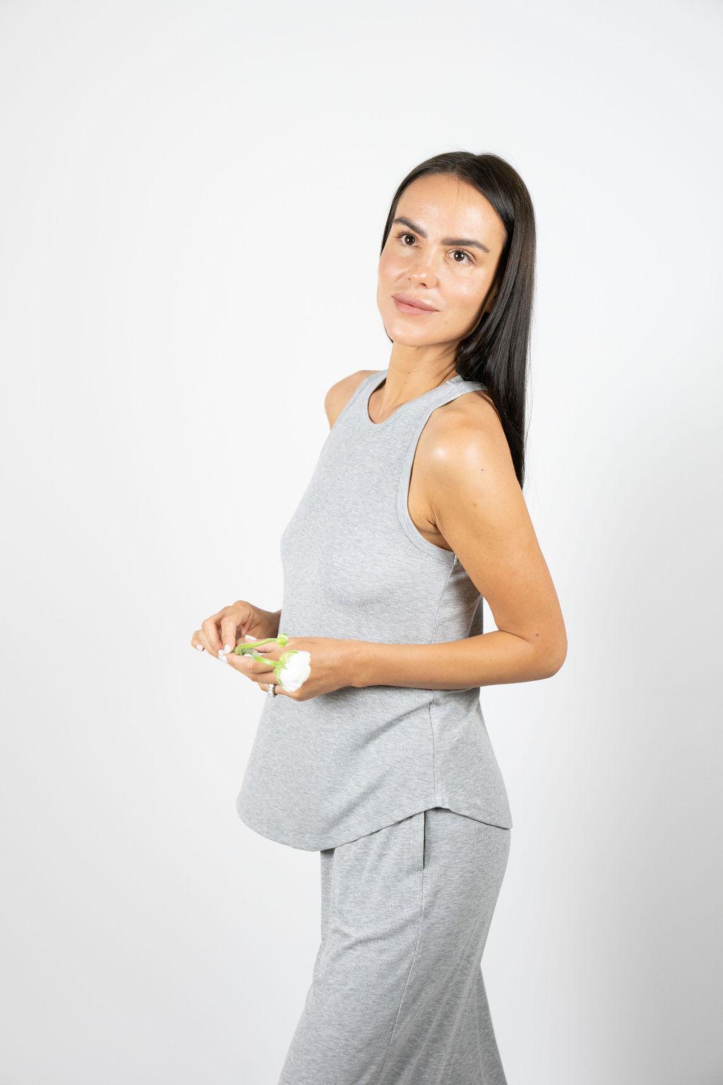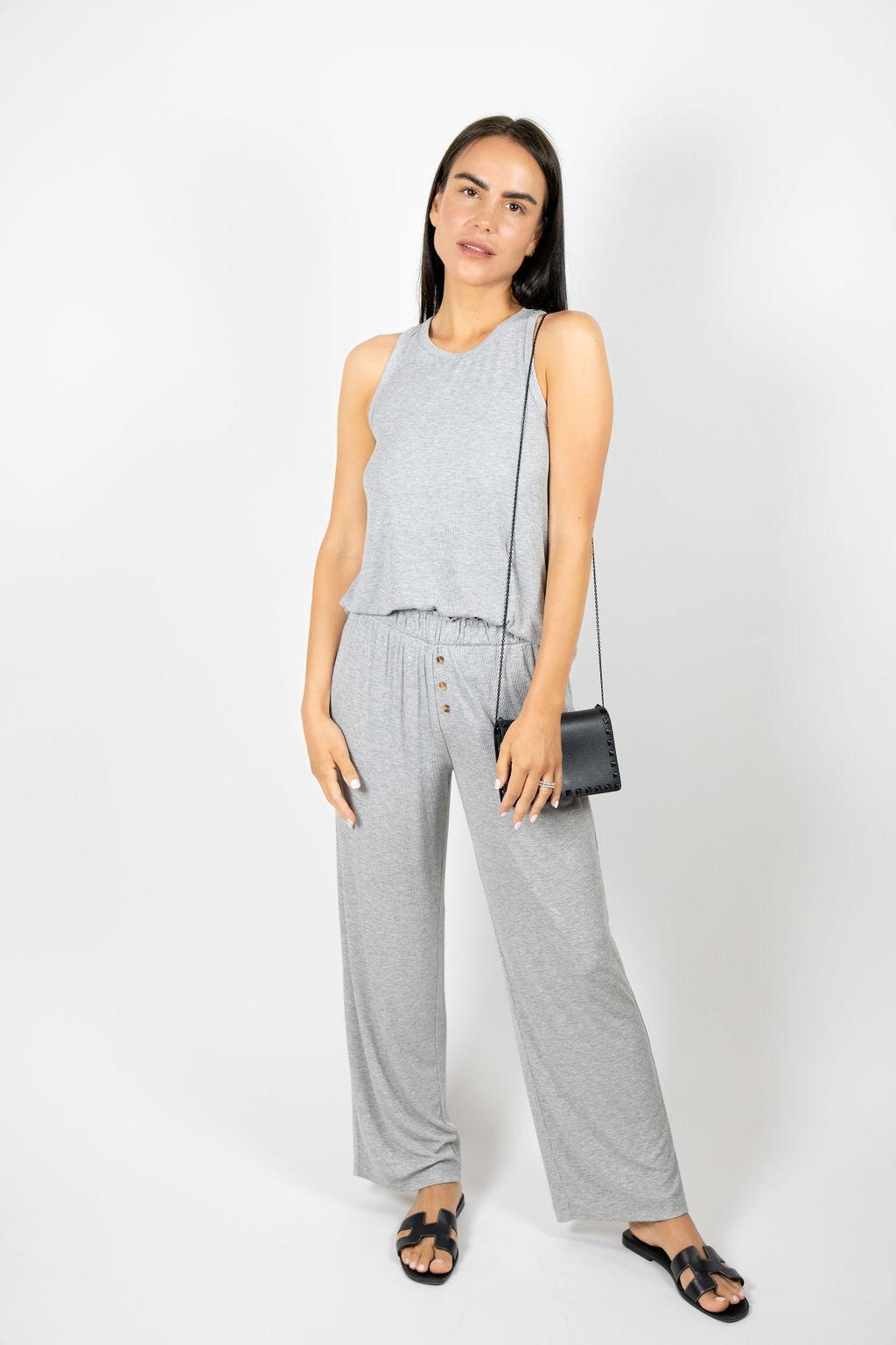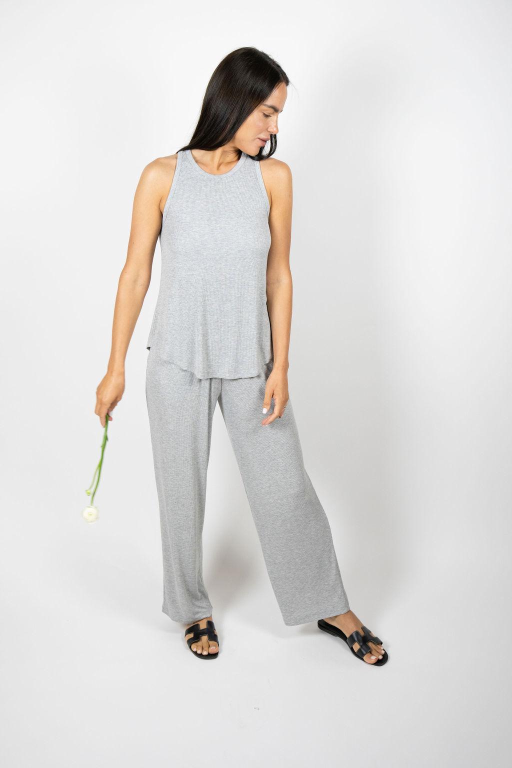 Description Relaxed tank top with adjustable straps and a built-in shelf bra Wide-leg Slightly cropped pull-on pants with practical side pockets and brown-toned buttons Specifications